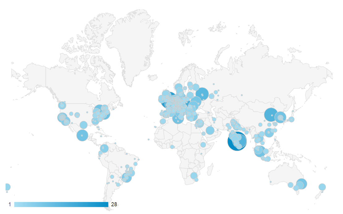 OWLGrEd is being downloaded around 100 times each month. The above image shows cities with circle size representing the number of times it has been downloaded from within that city.